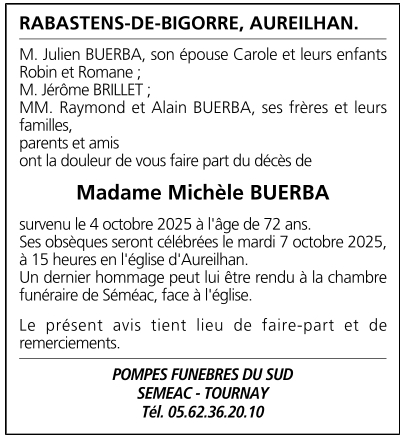 Décédée à Tarbes (65000, France) le samedi 4 octobre 2025 à l'âge de 72 ans