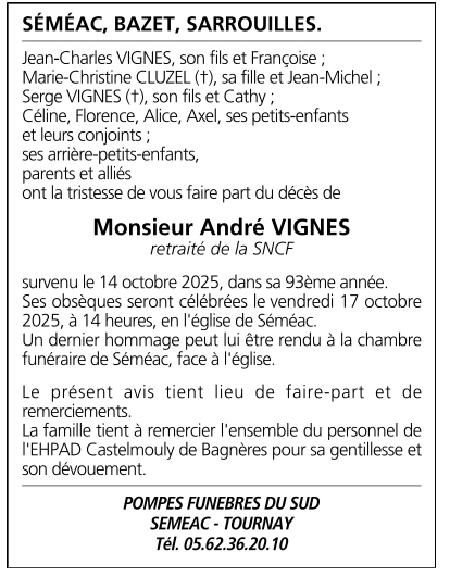 Décédé à Bagnères-de-Bigorre (65200, France) le mardi 14 octobre 2025 à l'âge de 92 ans