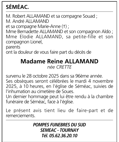 Décédée à Tarbes (65000, France) le mardi 28 octobre 2025 à l'âge de 95 ans