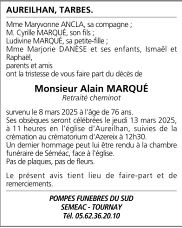 Décédé à Tarbes (65000, France) le samedi 8 mars 2025 à l'âge de 76 ans